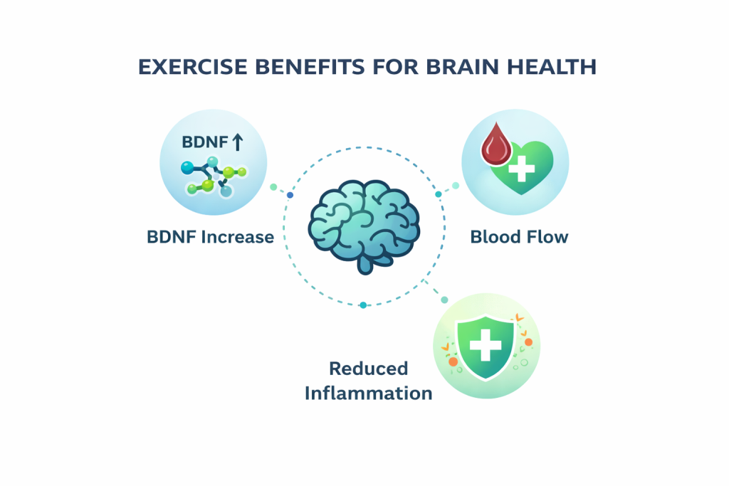Exercise is one of the most powerful interventions for brain health. It increases BDNF (brain-derived neurotrophic factor) by over 300%, improves cerebral blood flow by 30%+, reduces inflammation, and can even increase hippocampal volume over time.