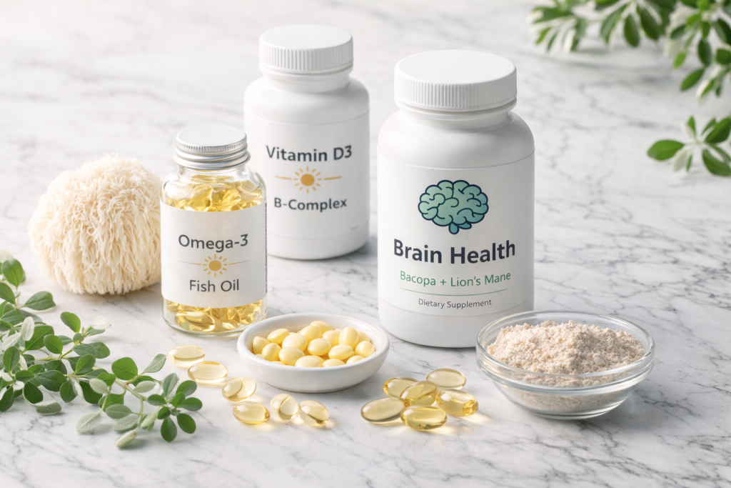 Brain supplements can provide additional support when foundational habits are established. Omega-3 fatty acids have the strongest evidence, with a 2024 study showing 31% dementia risk reduction. Additionally, other evidence-backed options include Bacopa Monnieri, Lion’s Mane, and Phosphatidylserine.