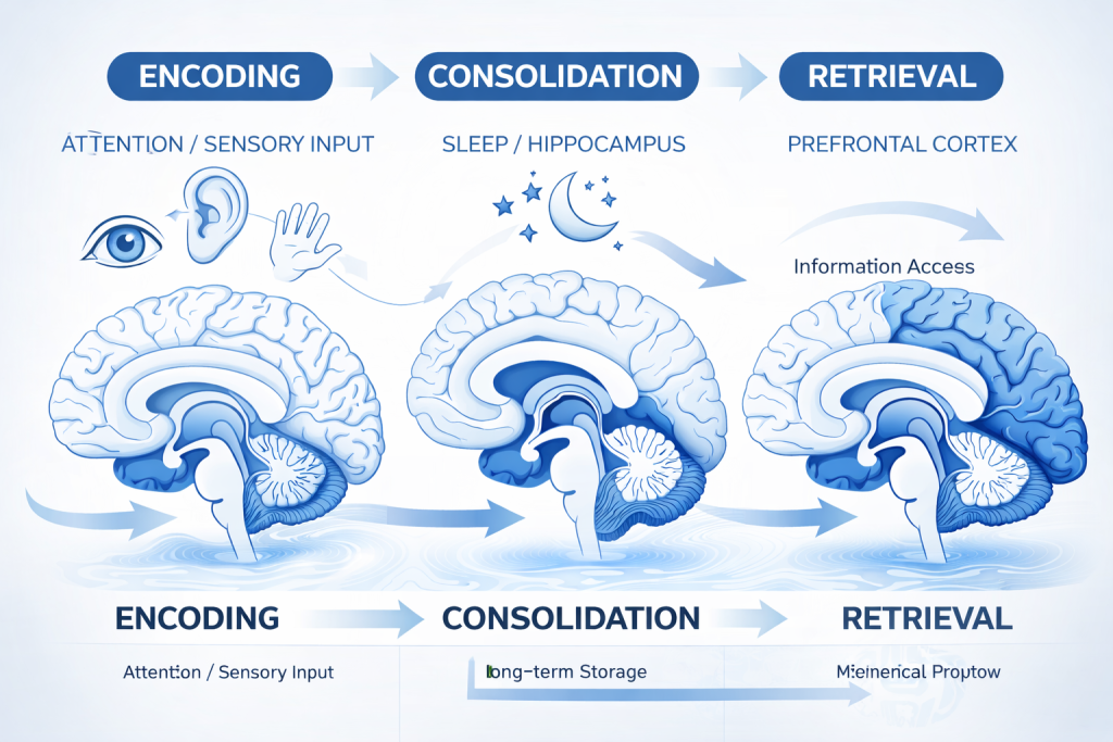 Natural ways to improve memory after 40 diagram showing the three stages of memory formation — encoding, consolidation, and retrieval