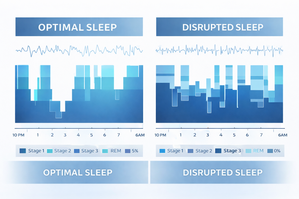 Sleep optimization chart comparing healthy versus disrupted sleep architecture for memory improvement after 40